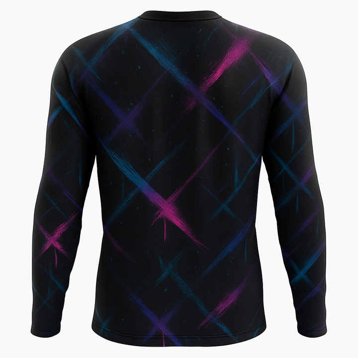 Illuminate the night with this Neon Streaks long sleeve mtb cycling jersey, showcasing dynamic pink, purple, blue, and teal brushstroke lines crisscrossing a black base with starry speckles for a cosmic, graffiti-inspired glow. Compression-fit and UV-protective fabric ensures all-weather comfort for road cycling, night gravel quests, and high-energy group rides—ideal for cyclists craving retro-futuristic flair in their extended-coverage bike gear.
