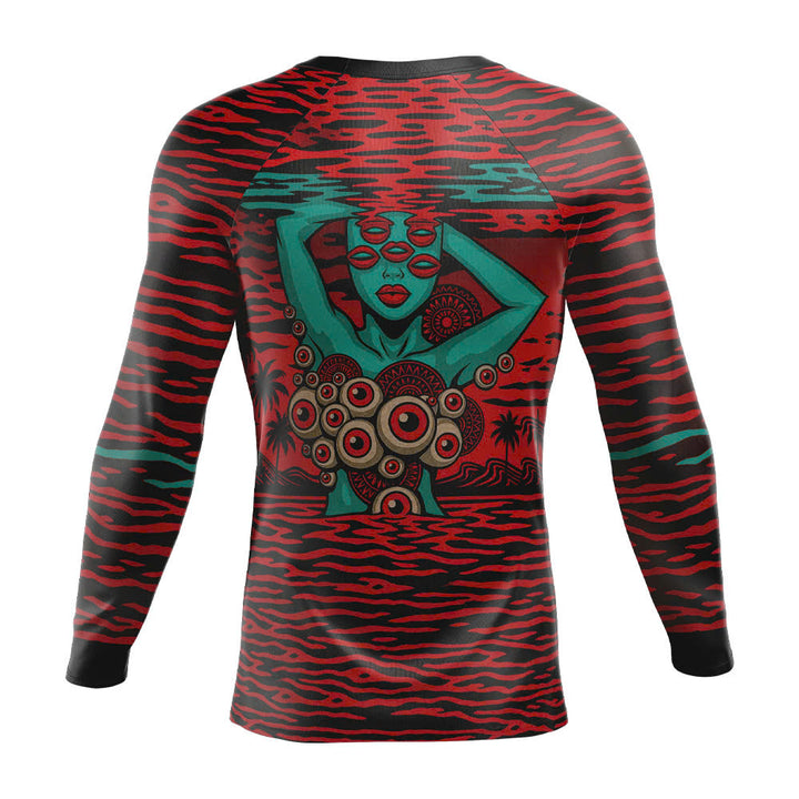 Turn heads with this psychedelic MTB jersey in red and teal, featuring a striking illustrated figure with surreal detail. Built for long trail days, enduro stages, and bike-park adventures, it blends eye-catching art with durable comfort.